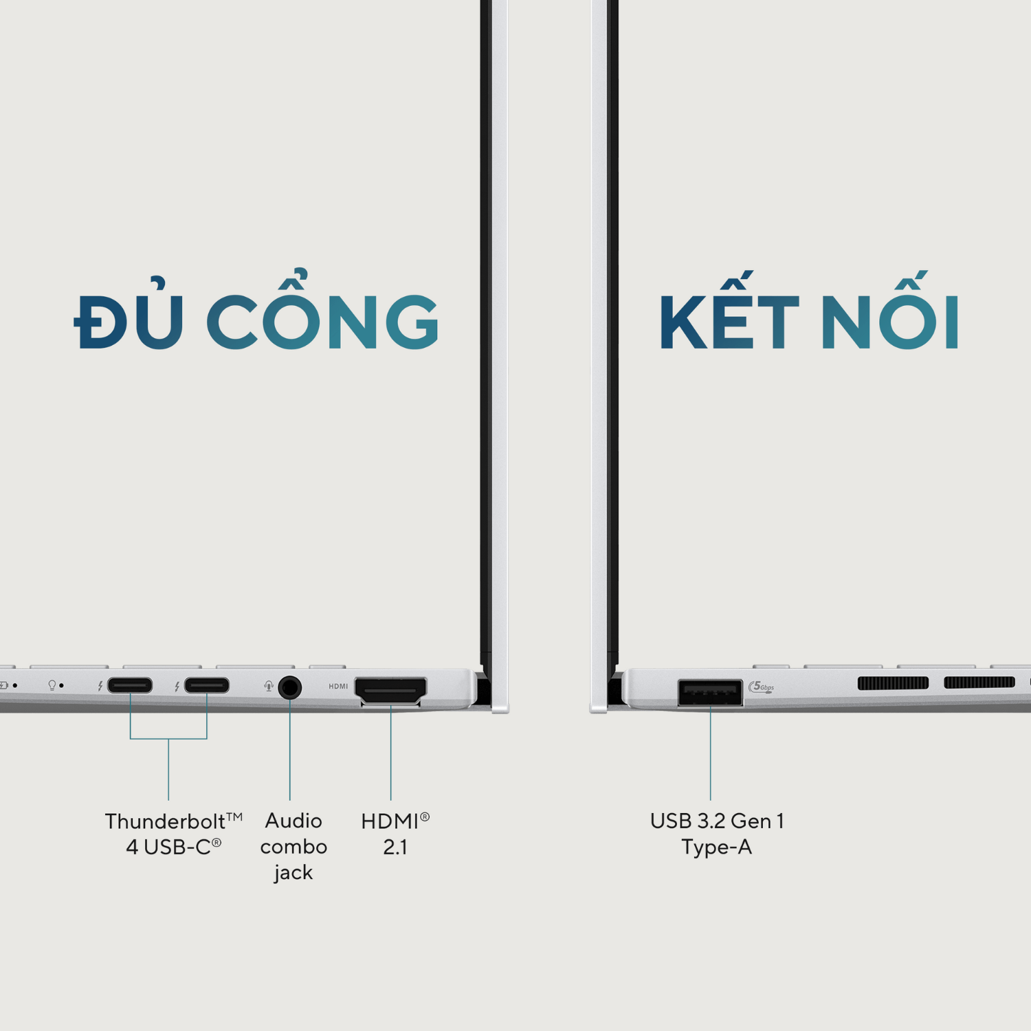 ASUS Zenbook 14 OLED UX3405 mang đầy đủ các cổng kết nối thiết yếu để bạn có thể dễ dàng kết nối và sử dụng mọi lúc, mọi nơi mà không cần mang theo dây nguồn và bộ cổng kết nối phức tạp. Điều này bao gồm 2 cổng Thunderbolt 4 tốc độ cao, USB Type-A và HDMI, giúp đơn giản hóa trải nghiệm kết nối của bạn. Đặc biệt còn có cả chỗ cho giắc cắm âm thanh thuận tiện!